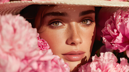 Brunette woman with natural makeup and light brown eyes surrounded by vibrant pink peonies, wearing a wide-brimmed straw hat for a fresh skincare and floral-themed portrait