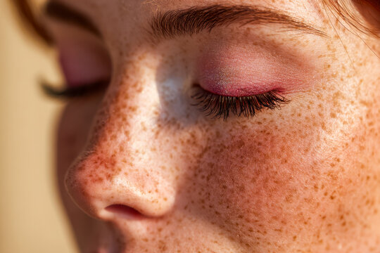 Close-up of a woman's freckled face with closed eyes and pink eye makeup