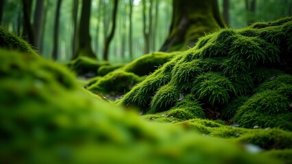 Step into mesmerizing realm of a verdant forest floor adorned with velvety blankets of moss that bec