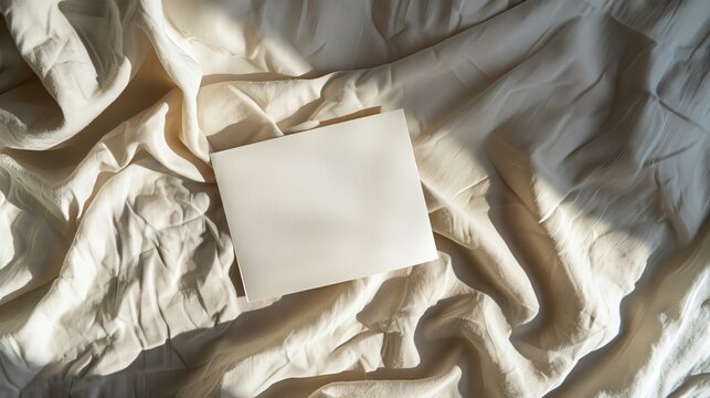 Blank paper card sheets with copy space on wrinkled bed blanket cloth with aesthetic warm sunlight shadows Flat lay top view