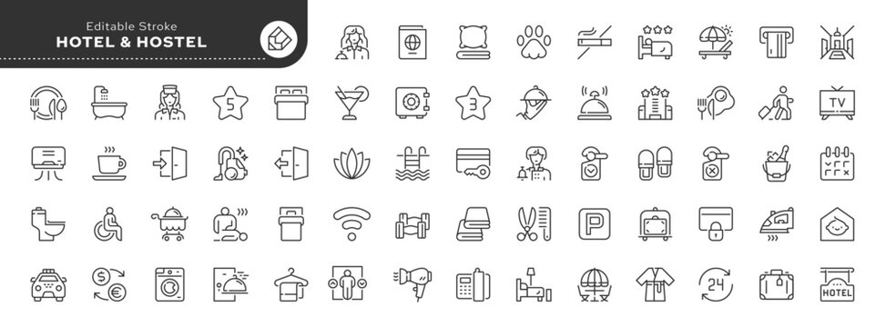 Sleep icon set. Containing bedroom, dream, pillow, sleeping, earplugs, moon, rest, lullaby, night, insomnia, bed, alarm clock and more. Editable line icons. Vector illustration.