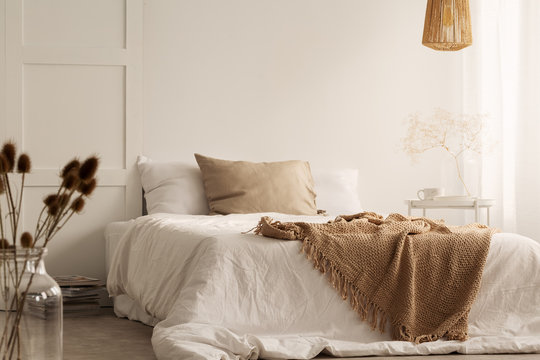 Flowers and lamp in white natural bedroom interior with blanket and pillows on bed. Real photo