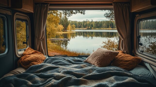 Neat, inviting camper bed with layered blankets, window curtains tied back to reveal a peaceful lakeside scene