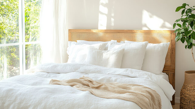 Serene bedroom scene featuring cozy bed adorned with white linens and decorative pillows