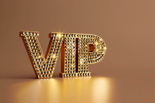 gold metallic standing 3d letters bedazzled with diamonds in shape of text "VIP" gold  background