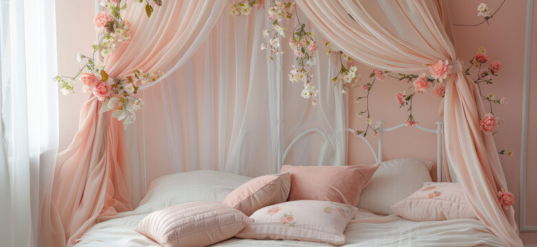 Luxurious bedroom with a window, with a large empty double bed with white linens and pillows. Comfortable sleep