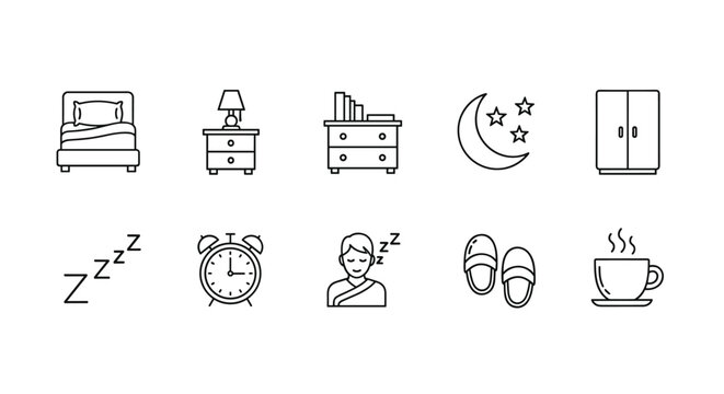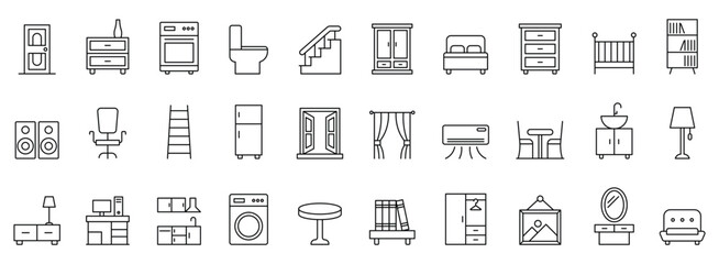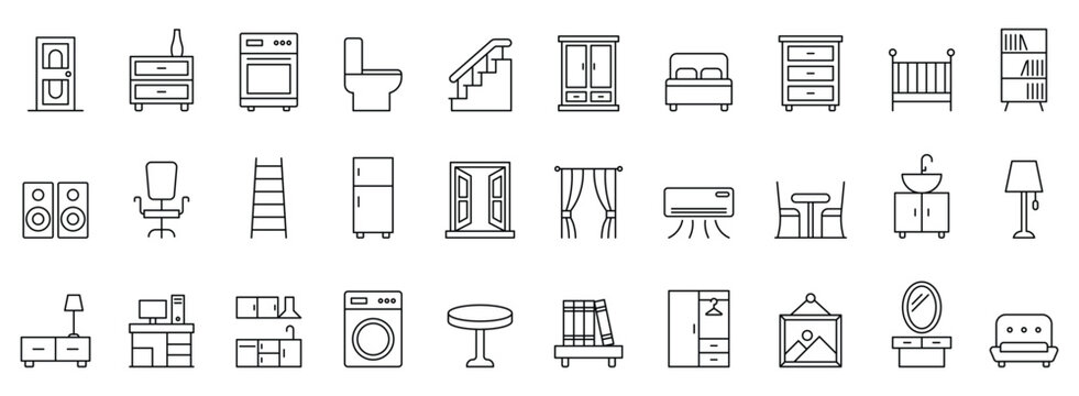 Furniture and home decor line icon set. Stylish home interior icon set. Featuring furniture, living room, bedroom, and bathroom essentials. Furniture line icon set.
