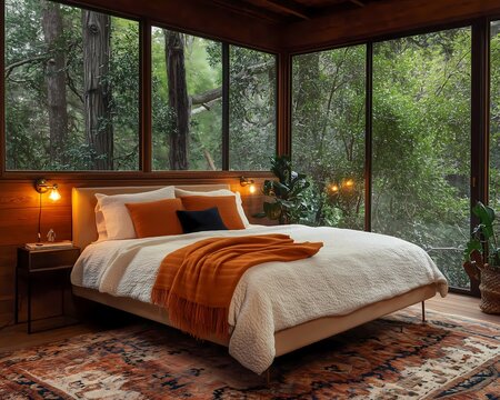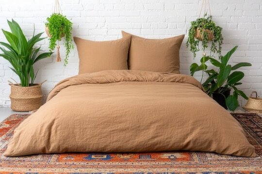 A bedroom with a bohemian vibe, featuring layered rugs, hanging plants, and a bed adorned with textured throws and pillows