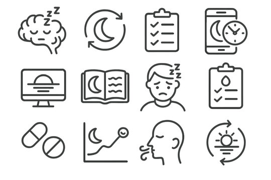 Sleep and health icon set illustrating rest, monitoring, and relaxation