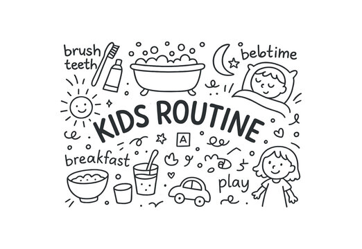 Cute doodle style illustration with large central word Kids Routine surrounded by various simple stroke line art doodles like brush teeth bath bedtime breakfast and play