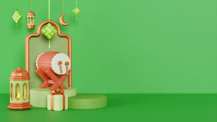 Islamic decoration background with podium, bedug drum, lantern and ketupat. 3D Animation
