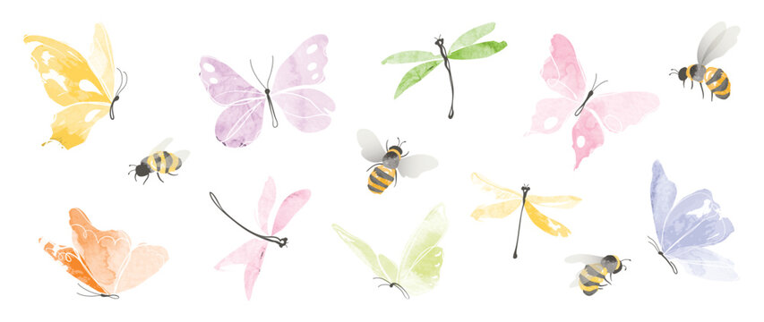 Watercolor insect seamless pattern with illustration of flying bumblebee, bee. Detailed elements isolated on white background. Perfect for wrapping, invitation, web design, bed linen, textiles.