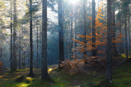 Forest of Beech and oak Trees illuminated by sunbeams through morning mist