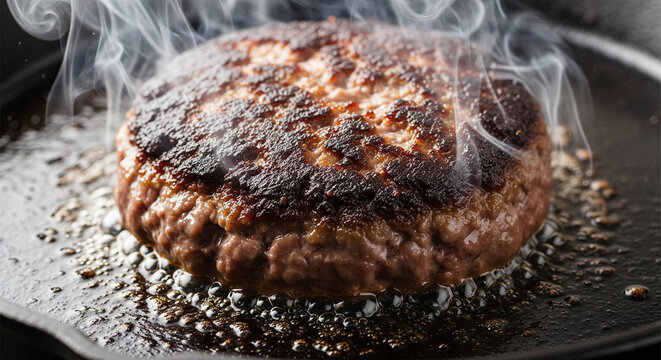 Thick Beef Patty Searing and Smoking in a Hot Cast Iron Pan.
