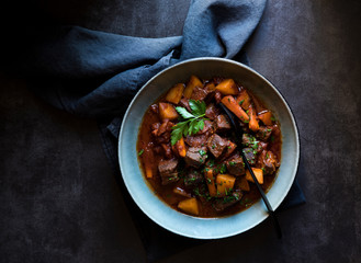 Beef stew with potatoes, carrots and herbs