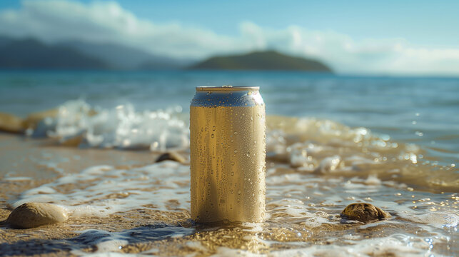 bottle on the beach, Tall silver beer can, closeup. Space for design, drink can on beach, blue sky