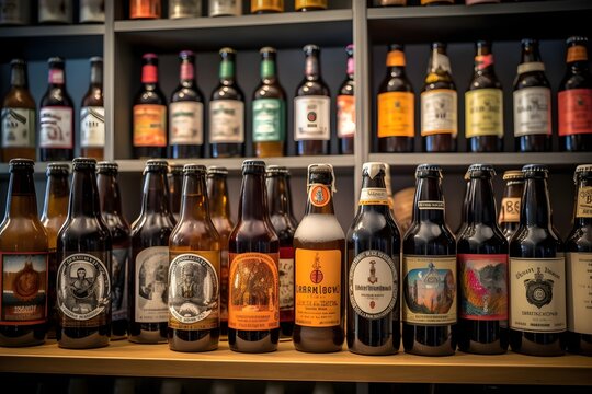 An image showing a range of artisanal beer bottles with handwritten labels, displayed on a wooden shelf.