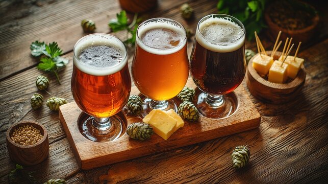 Craft beer varieties displayed in elegant stemmed glasses with perfect foam heads alongside brewing ingredients and cheese cubes on rustic wooden board setup