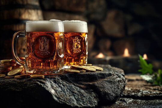 Frothy beer mugs on rustic stone table with glowing coins and firelight ambiance. St Patrick's day.
