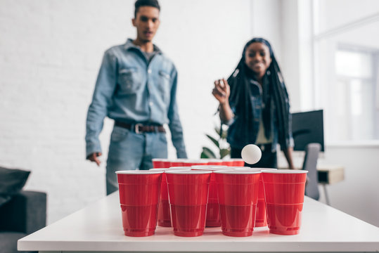 closeup shot of ball flying in plastic cup in beer pong game and young multicultural couple standing behind