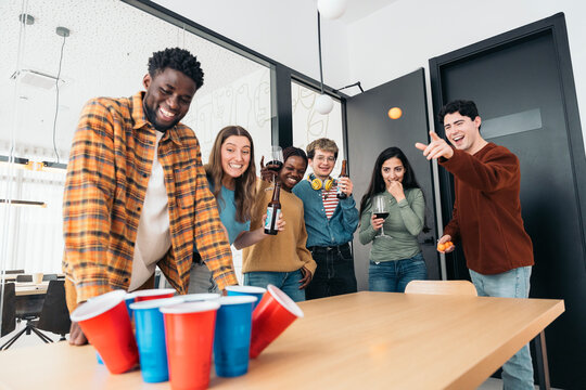 Group of young friends playing beer pong at party