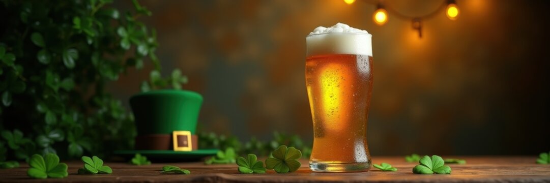 Celebrate St. Patrick's Day with a refreshing beer and festive decorations. Perfect for promotions, events, or advertisements related to this lively holiday.