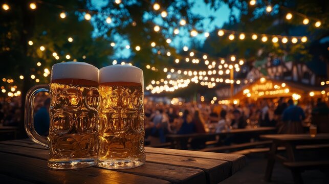 Beer mugs outdoor, festive outdoor lighting, night time celebration, beer garden scene, party atmosphere, social gathering