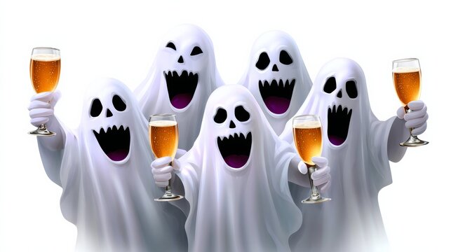 A group of ghosts are holding glasses of beer and smiling. The image has a fun and lighthearted mood, as the ghosts are celebrating a holiday or a special occasion
