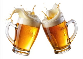 Two flying beer glasses with perfectly poured golden brew and creamy foam, appearing to toast each other in mid-air against a transparent background.