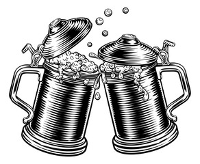 Two beer stein German Oktoberfest pint tankard mugs in a retro vintage intaglio woodcut engraved style