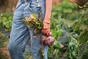 Woman holding common beets in orchard
