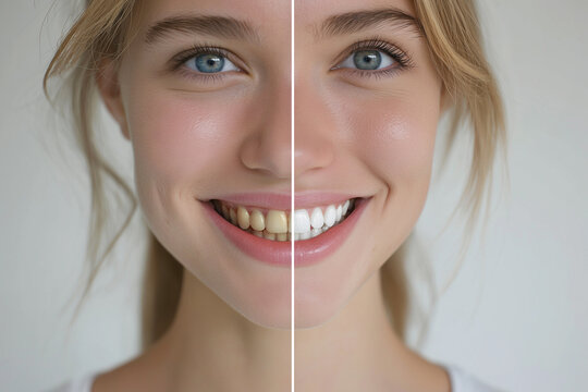 Professional teeth whitening and cleaning. Young smiling woman showing before and after results. Stomatology and dental clinic concept. Teeth bleaching advertising collage
