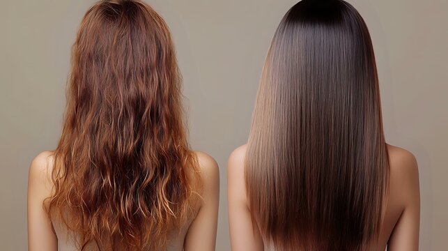 Before and after hair treatment comparison showing wavy frizzy brown hair transformed into smooth straight glossy brunette result on neutral background.