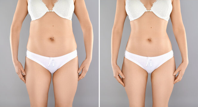 Collage, before after and face of woman for skincare, anti aging and beauty with surgery in studio. Female model, transformation and makeover with treatment, dermatology and change by gray background