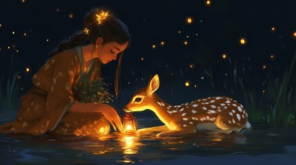 A serene young Asian girl with a lantern by a calm water, befriending a fawn at night.