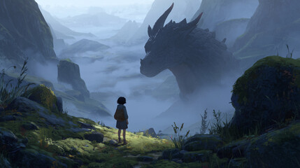 Young Girl Befriending A Dragon In A Misty Valley, Anime Fantasy Concept Art