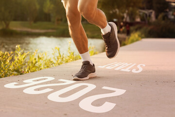 New 2026 Year. Man running on road with numbers and word Start, closeup