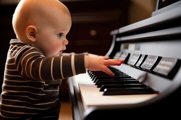child playing the piano - kid with arms raised over the keys of a piano - learning something new - start early to master - generative ai