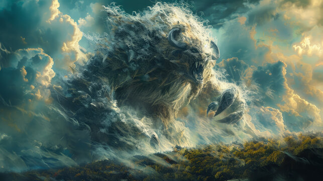 A colossal behemoth rising from the Earth, surrounded by lush landscapes, with digital art showcasing its immense presence