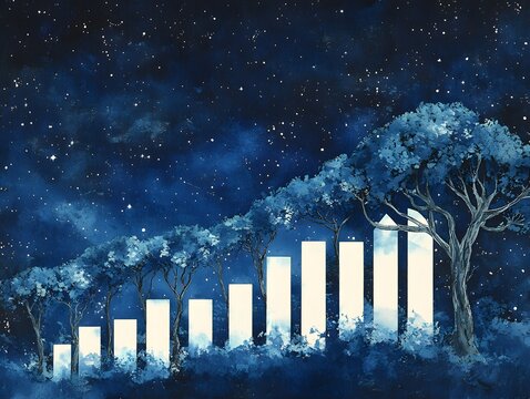 Abstract digital art tree with growing bar chart