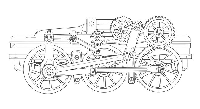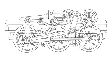 Steam engine train wheels mechanical engineering drawing vector illustration line art on transparent background