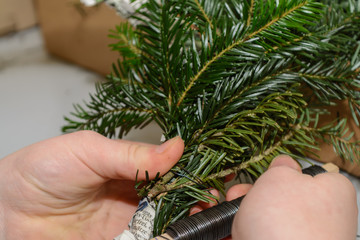 Tannenzweige werden bei Adventskranz gebunden