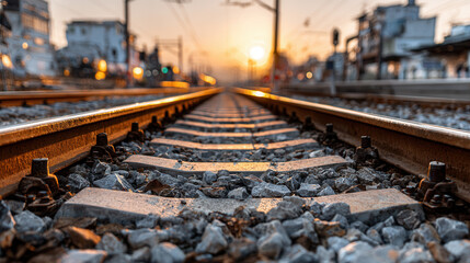 Captivating sunset view of railway tracks inviting the beholden to explore distant journeys and serene moments