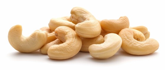 A pile of cashews on a white background. The cashews are arranged in a pyramid shape, with the top one being the largest. The cashews are all the same size and shape
