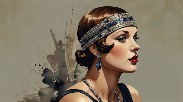 Watercolor Painting: This captivating Art Deco portrait captures the essence of a sophisticated flapper. With her bobbed hair, bejeweled headband, and bold lipstick,