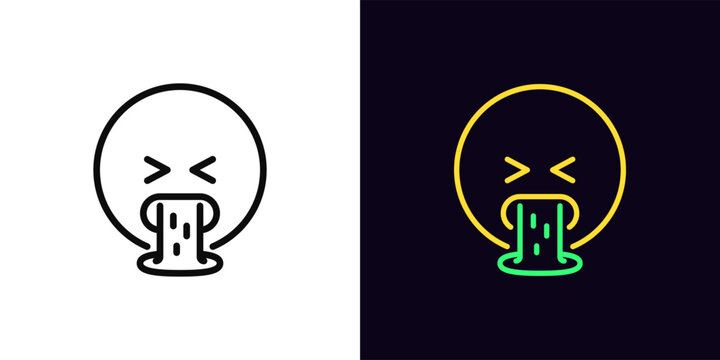 Outline vomiting emoji icon, with editable stroke. Spew emoji, disgust feeling. Emoticon vomit, mouth with puke, dislike reaction, sick emoji, barf face, nausea emoticon, belch expression. Vector icon