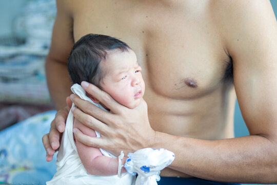 Beautiful young Asian father hold newborn baby boy with hand to help baby belch or Making burp after feeding