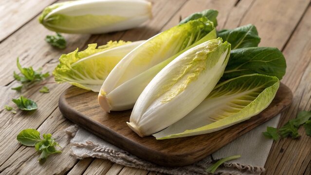 Fresh belgian endive lettuce on a rustic wooden board with herbs