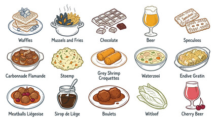 Belgium food set featuring Belgian Waffles, Fries, Mussels, Chocolate, Beer & Speculoos. Perfect for menus, apps, websites & culinary designs