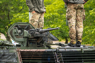 Soldiers on a Stryker combat military vehicle with a machine gun and an anti-drone laser system aimed at the sky in Ukraine during the counteroffensive against Russia